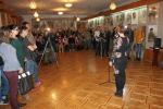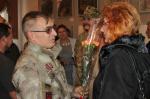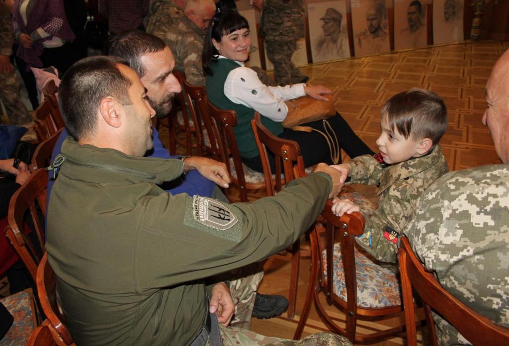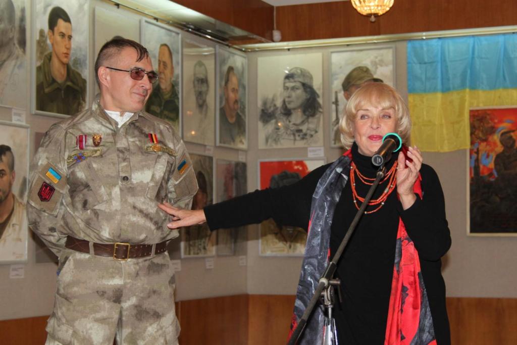 Серед промовців і відвідувачів, присутніх у залі, були також герої, чиї обличчя бачимо в галереї експонованих портретів. Це, зокрема, начальницького складу кремезний друг Покутяка (Максим Швець, на пешій світлині) – він брав слово. Автографи побратимів збирав у книжку-альбом кірборг і творча людина Юрій Заблоцький. А ще привертали увагу колоритні постаті старшого покоління, серед них сивобородий, не по роках підтягнутий 77-річний друг Дід (до нього з пошаною й цікавістю горнулася молодь, слухаючи мудрі настанови). Запам’яталося й палке вітальне слово народної артистки України Ади Роговцевої, яка особисто знайома з багатьма учасниками бойових дій (а вела програму, до слова, її донька заслужений діяч мистецтв України Катерина Степанкова). Останню нарівні з героями-добровольцями було удостоєно відомчої відзнаки з рук вояків у переддень всенародних свят.