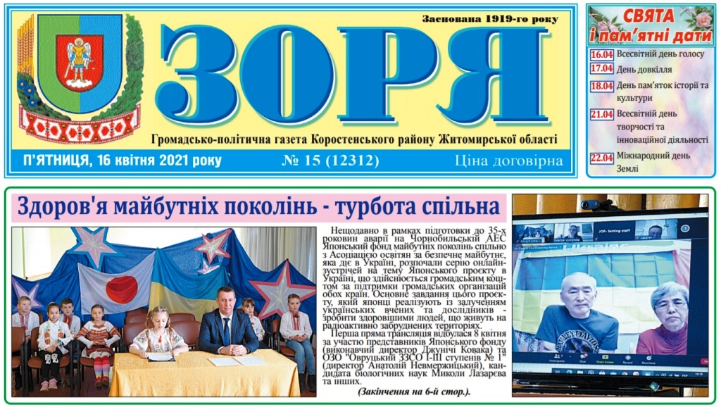 А ще 12 трансляцій наживо організували й спільно провели у квітні Японський фонд майбутніх поколінь і громадська організація «Асоціація освітян за безпечне майбутнє», яку очолює директор школи з Овруцького району Житомирщини Микола Слепенчук. Відбулися теплі, щирі й водночас інформативні спілкування з учнями, вчителями, медиками, батьками дітей – учасників Японського проєкту. Коли на відеозв’язку перебували Народичі (Житомирщина, 23 квітня), змістовну презентацію в етері зробив Микола Лазарєв. Він працює в Національному університеті біоресурсів і природокористування України та як фахівець у галузі радіобіології консультує з 2015 року ініціаторів соціального проєкту, що здійснюється, наголосимо, громадським коштом, зусиллями японських доброчинців.