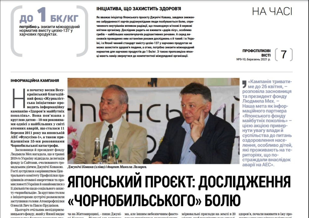 Інформаційна кампанія «Здоров’я майбутніх поколінь», яку оголосив 11 березня цього року всеукраїнський фонд «Журналістська ініціатива» і яку підтримує творча спілка, добігає кінця 26 квітня – в день 35-х роковин Чорнобильської катастрофи. За попередніми підсумками, майже півсотні публікацій, телесюжетів, радіо- і відеотрансляцій цієї тематики побачили світ у нашій країні і Японії з ініціативи лише учасників і партнерів соціального Японського проєкту.
