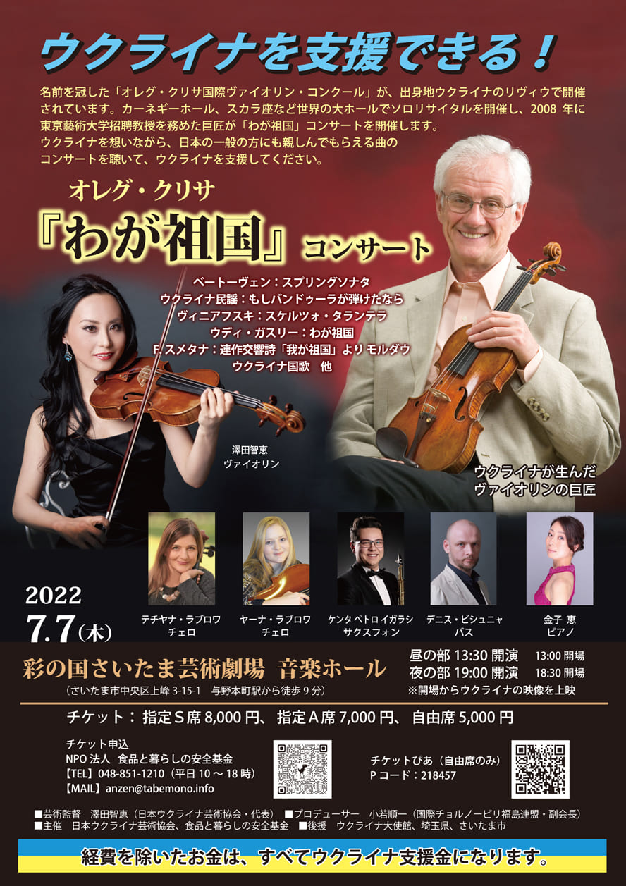 Того ж дня журналісти побачили ще один зворушливий вияв прихильності жителів Японії до України. Незабаром – 7 липня – в Сайтамі відбудеться концерт видатного українського скрипаля Олега Криси. Активний громадський діяч Джунічі Ковака, який сприяє в організації культурної події, похвалився: «Я дістав подарунок від Хіроко Накадзіми, яка подала заявку на концерт 7 липня. Ось ці чудові значки у вигляді прапора України, а також інші сувеніри в синьо-жовтих кольорах – від душі зроблений внесок шанувальниці в підтримку вашої країни». Серед перших ці значки приміряли в Сайтамі українські журналісти.