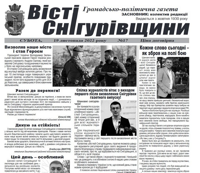 Ще одна добра новина з Миколаївщини: перший після визволення Снігурівки номер газети видано за сприяння й фінансової підтримки НСЖУ та іноземних благодійників. Про це повідомила інформаційна служба творчої спілки 21 листопада. «Кожне слово сьогодні – це зброя на інформаційному полі бою», – читаємо в редакційній статті свіжих «Вістей Снігурівщини» – так місцева газета з 92-річною історією пише про свою участь «у боротьбі за перемогу».