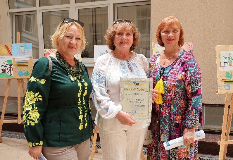 До слова, Марина разом з киянкою Наталією Черешинською (обидві мають почесне звання «Заслужений журналіст України») відвідала відкриття виставки в столиці, а Наталія, за дорученням правління фонду «Журналістська ініціатива», привітала колег подарунками, які надіслав з Японії Джунічі Ковака.