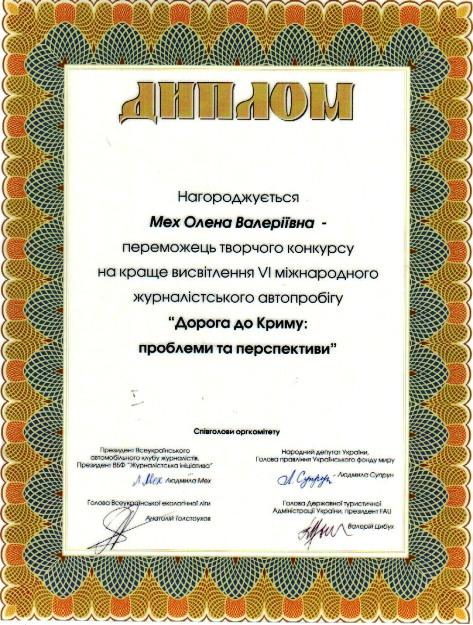 Відзначена дипломом переможця у творчому конкурсі на краще висвітлення VI Міжнародного журналістського автопробігу "Дорога до Криму: проблеми та перспективи" (2004).