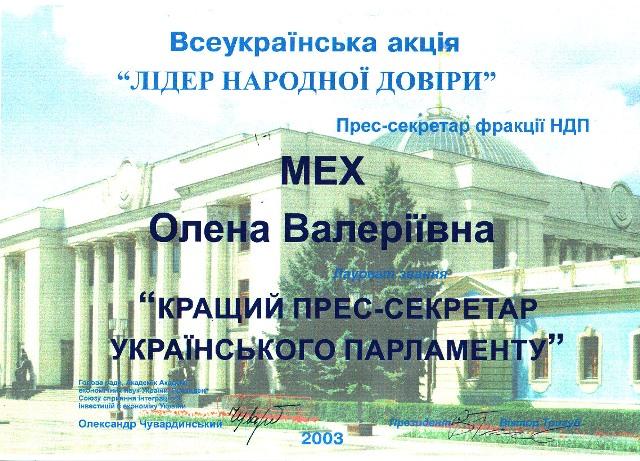 Лауреат Всеукраїнської акції "Лідер народної довіри" в номінації "Кращий прес-секретар українського парламенту" (2003).
